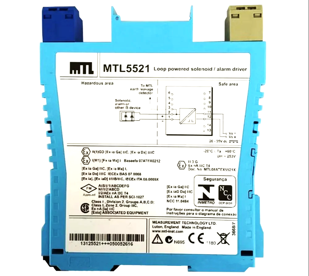 The MTL5521 and the MTL4521L are loop-powered modules which enable a device located in the hazardous area to be controlled from the safe area. They can all drive a certified intrinsically safe low-power load, as well as non-energy-storing simple apparatus such as an LED.