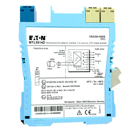 The MTL5514D enables two safe–area loads to be controlled, through relays, by a proximity detector or switch located in a hazardous area. When selected, open or short circuit conditions in the field wiring are detected by the line fault detect (LFD) facility and indicated on the top of the module. Switches are provided to select phase reversal and to enable the line fault detection.