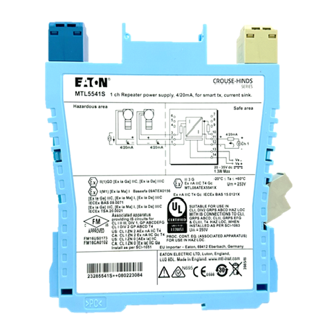 The MTL5541 provides a fully-floating dc supply for energising a conventional 2- or 3-wire 4/20mA transmitter, which is located in a hazardous area, and repeats the current in another floating circuit to drive a safe-area load. For HART 2-wire transmitters, the unit allows bi-directional communications signals superimposed on the 4/20mA loop current. Alternatively, the MTL5541S acts as a current sink for a safe-area connection rather than driving a current into the load. Separately powered current sources, such as 4-wire transmitters, can be connected but will not support HART communication.