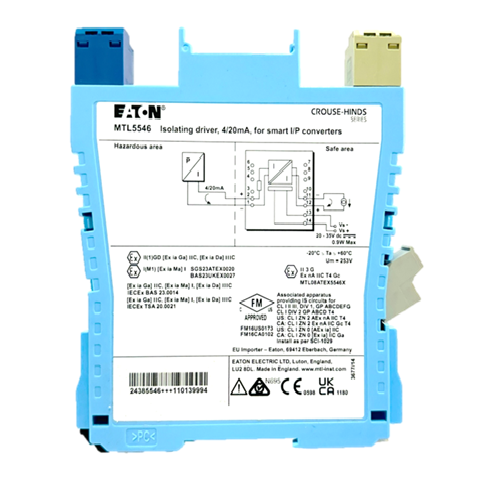 The MTL5546 accepts a 4/20mA floating signal from a safe-area controller to drive a current/pressure converter (or any other load up to 800Ω) in a hazardous area. For HART valve positioners, the module also permits bi-directional transmission of digital communication signals. Process controllers with a readback facility can detect open or short circuits in the field wiring: if these occur, the current taken into the terminals drops to a preset level.