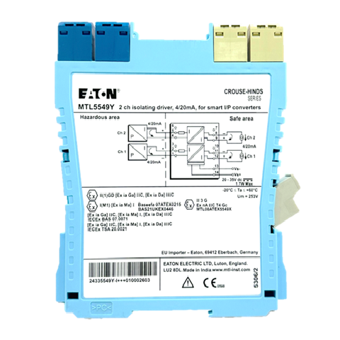 The MTL5549 accepts 4/20mA floating signals from safe-area controllers to drive 2 current/pressure converters (or any other load up to 800Ω) in a hazardous area. For HART valve positioners, the module also permits bi-directional transmission of digital communication signals. Process controllers with a readback facility can detect open or short circuits in the field wiring: if these occur, the current taken into the terminals drops to a preset level.