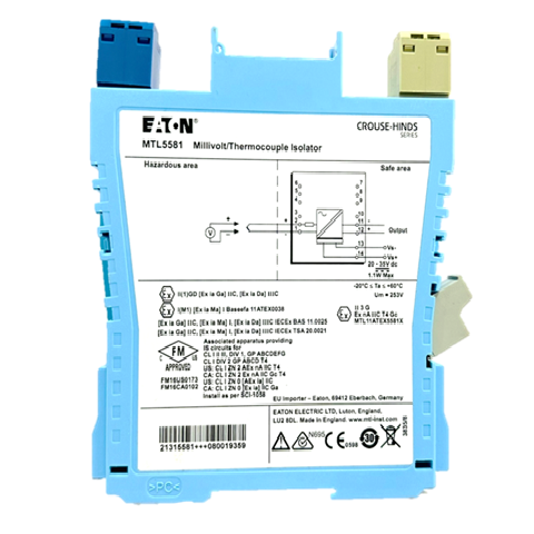 The MTL5581 takes a low-level dc signal from a voltage source in a hazardous area, isolates it, and passes it to a receiving instrument located in the safe area. The module is intended for use with thermocouples utilising external cold-junction compensation. A switch enables or disables the safety drive in the event of thermocouple burnout or cable breakage; a second switch permits the selection of upscale or downscale operation as appropriate.