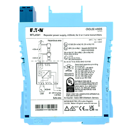 The MTL4541 provides a fully-floating dc supply for energising a conventional 2- or 3-wire 4/20mA transmitter, which is located in a hazardous area, and repeats the current in another floating circuit to drive a safe-area load. For HART 2-wire transmitters, the unit allows bi-directional communications signals superimposed on the 4/20mA loop current. Alternatively, the MTL4541S acts as a current sink for a safe-area connection rather than driving a current into the load. Separately powered current sources, such as 4-wire transmitters, can be connected but will not support HART communication.