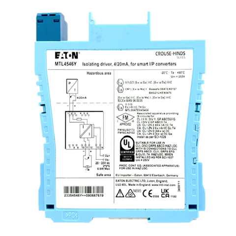 The MTL4546 accepts a 4/20mA floating signal from a safe-area controller to drive a current/pressure converter (or any other load up to 800Ω) in a hazardous area. For HART valve positioners, the module also permits bi-directional transmission of digital communication signals. Process controllers with a readback facility can detect open or short circuits in the field wiring: if these occur, the current taken into the terminals drops to a preset level. The MTL4546C and the MTL4546Y are very similar to the MTL4546 except that they provide open circuit detection only